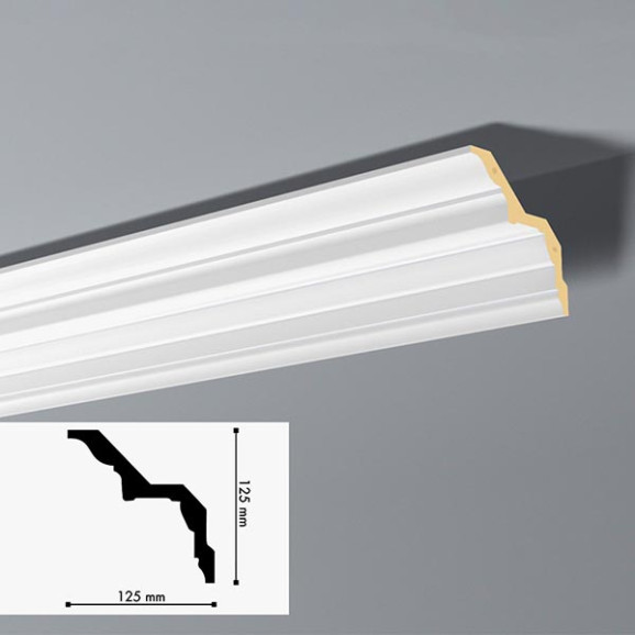 Roda-tetos de poliestireno extrudado (EPS ou Isopor) Nomastyl® em barras de 2.000 mm de comprimento com superfície lisa e verso canelado para melhor aderência da cola.